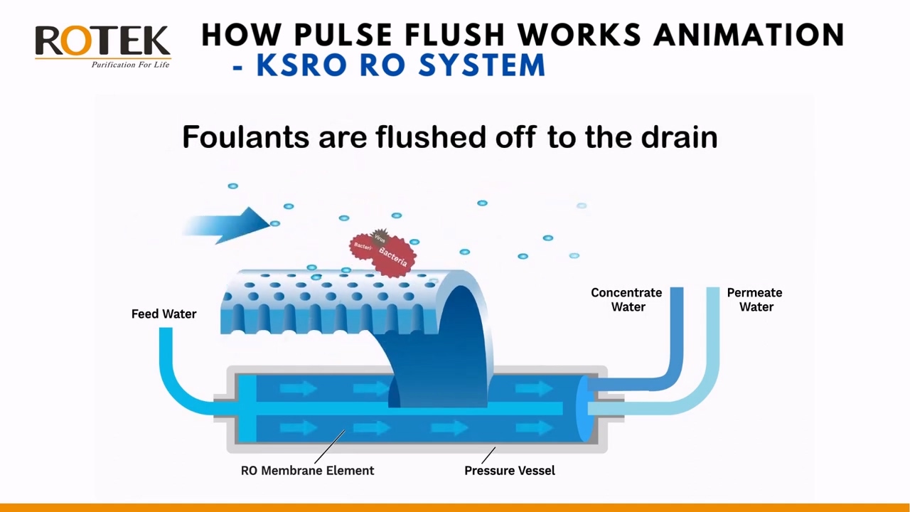 脈衝沖洗技術是 KSRO 系統的一大關鍵特色,它使得生產周期內系統能達到 100% 的回收率。在沖洗周期中,沖洗閥在濃縮水達到軟水或阻垢劑無法防止結垢的臨界濃度之前就會啟動。此外,短時間內膜表面流速的急劇變化會產生水錘效應,這也有助於震落膜表面的污垢,從而延長膜的清潔維持時間。