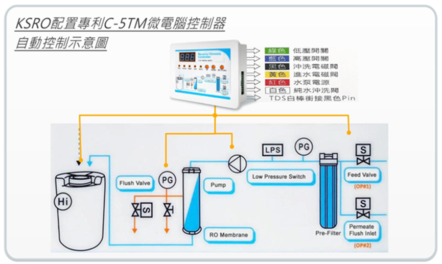高流量低壓RO膜XL4040-5000GP,比市面上使用的4040-RO膜,產水量提高2倍以上。KSRO純水機裝配1支XLRO膜,可產出4000GPD純水使用;裝配2支XLRO膜,能產出6000GPD純水使用。 - 面板上配置新型專利「C-5TM微電腦控制器」